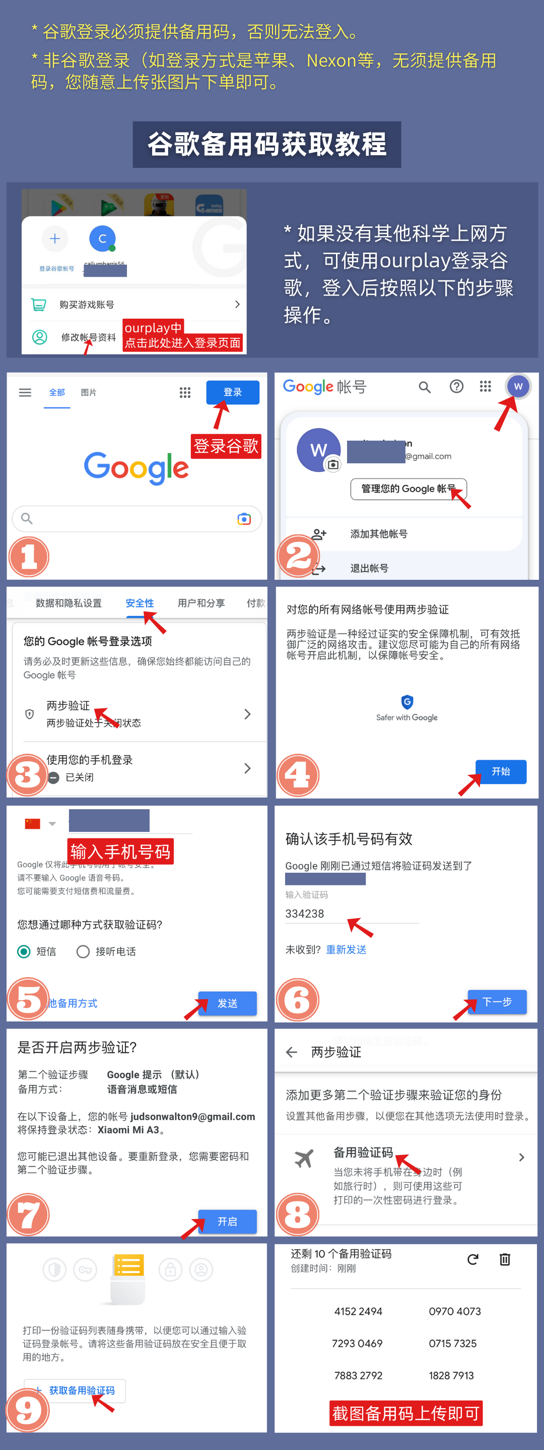 3.1谷歌如何开启备用码?适用所有用谷歌登录的游戏,如购买的暗影格斗,棕色尘埃,边狱公司等代充订单,需要提供谷歌备用码,我们上号充值哦,以下是相关操作截图1、如何开启备用码温馨提示:二步验证需要开启才可使用备用码作者:Kardz商城-帮助中心 创建时间:2024-12-04 11:31最后编辑:好开心 更新时间:2024-12-16 17:23