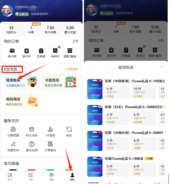 首页右下角点击我的——K宝专区——卡密预购——选择想要的商品——填写想要采购的数量——填写心理预期价格——选择提货时间——填写联系方式(方便客服能直接联系到您)——如有特殊要求可进行备注