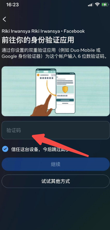 4、把获取到的验证码输入到Facebook双重验证页,进行登录操作即可