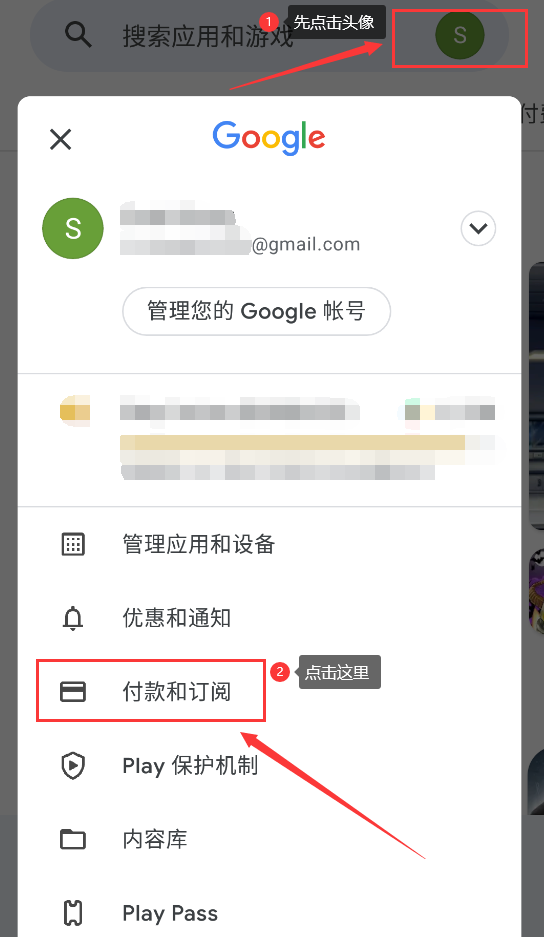 2、打开谷歌商店,点击右上角头像,再点击下方“付款和订阅”。