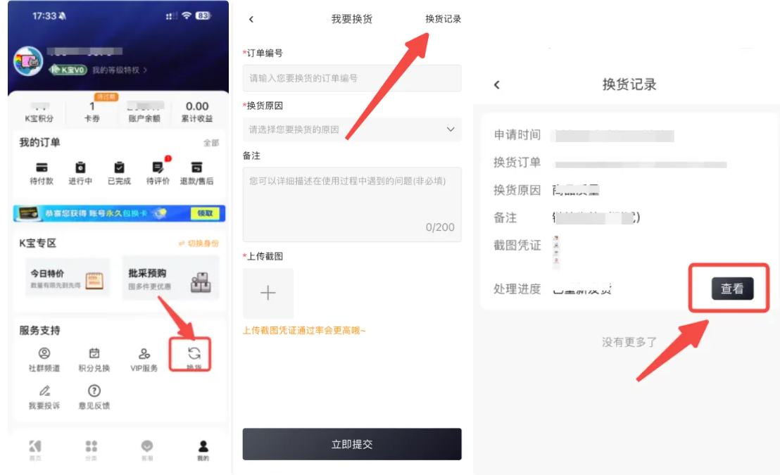 查询方式:【下载kardz的APP(没有APP有平台链接也行,必须手机端操作)】—【点击个人中心】——【点击换货】——【点击换货记录】——【点击查看】APP安装链接:https://www.kardz.cn/download1